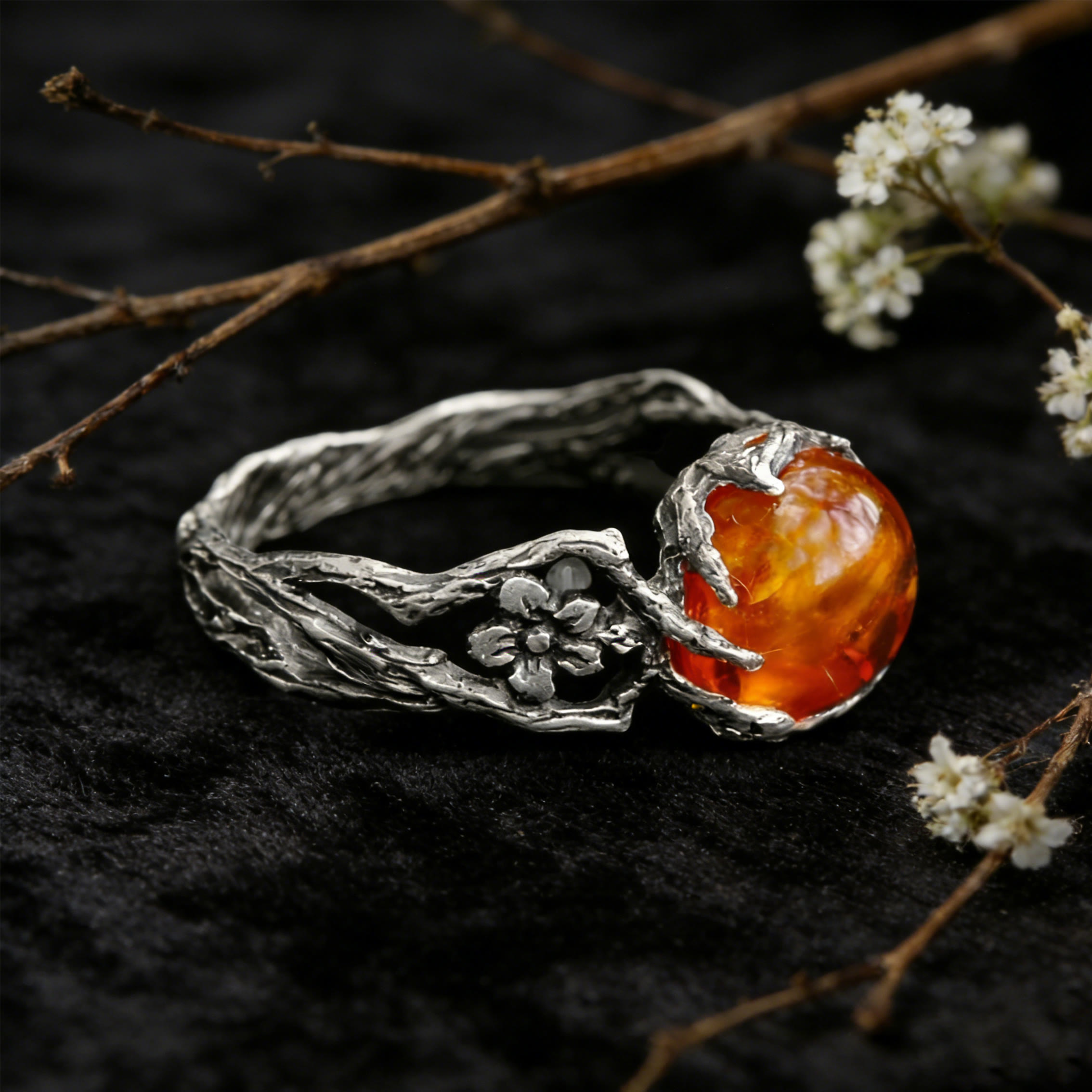- This Twig Tree Branch Floral Amber Ring stands as a vivid tribute to the Norse reverence for the sea’s quiet gifts. Meticulously shaped, the silver’s gnarled texture bears the rough, wind-scoured charm of driftwood that weathered centuries of storms, while the amber gem anchors the design in the belief that the sea holds the memories of the earth itself. Every curve ties back to the Viking understanding that beauty and magic are found in the slow, unrushed gifts of the natural world—turning everyday wear into a nod to the soft, enduring spirit of Norse coastal life. It’s a striking accessory that wraps the wearer in the mythic glow of amber’s ancient sunlight.