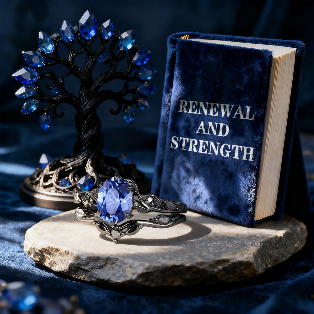Whispered from the ancient forests of the North, this exquisite ring set captures the quiet power of nature and the eternal beauty of the night sky. The deep blue sapphire gleams like moonlight over frozen lakes, while black moissanite accents shimmer like starlit frost between delicate leaves.
