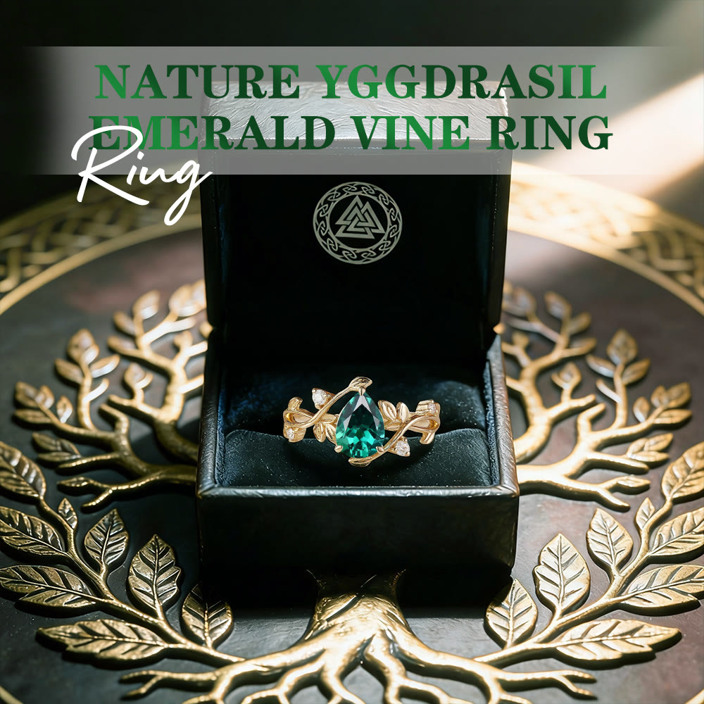 Inspired by the sacred forests and ancient beliefs of the Viking world, the Nature Yggdrasil Emerald Vine Ring embodies the harmony between strength, nature, and destiny. At its center lies a radiant emerald-green teardrop gemstone, symbolizing life force, renewal, and the eternal cycle guarded by Yggdrasil—the World Tree of Norse mythology.