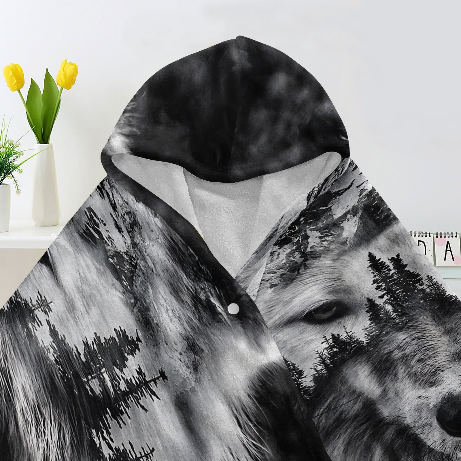 WorldNorse Mountainscape Pinewood Wolf Hooded Blanket