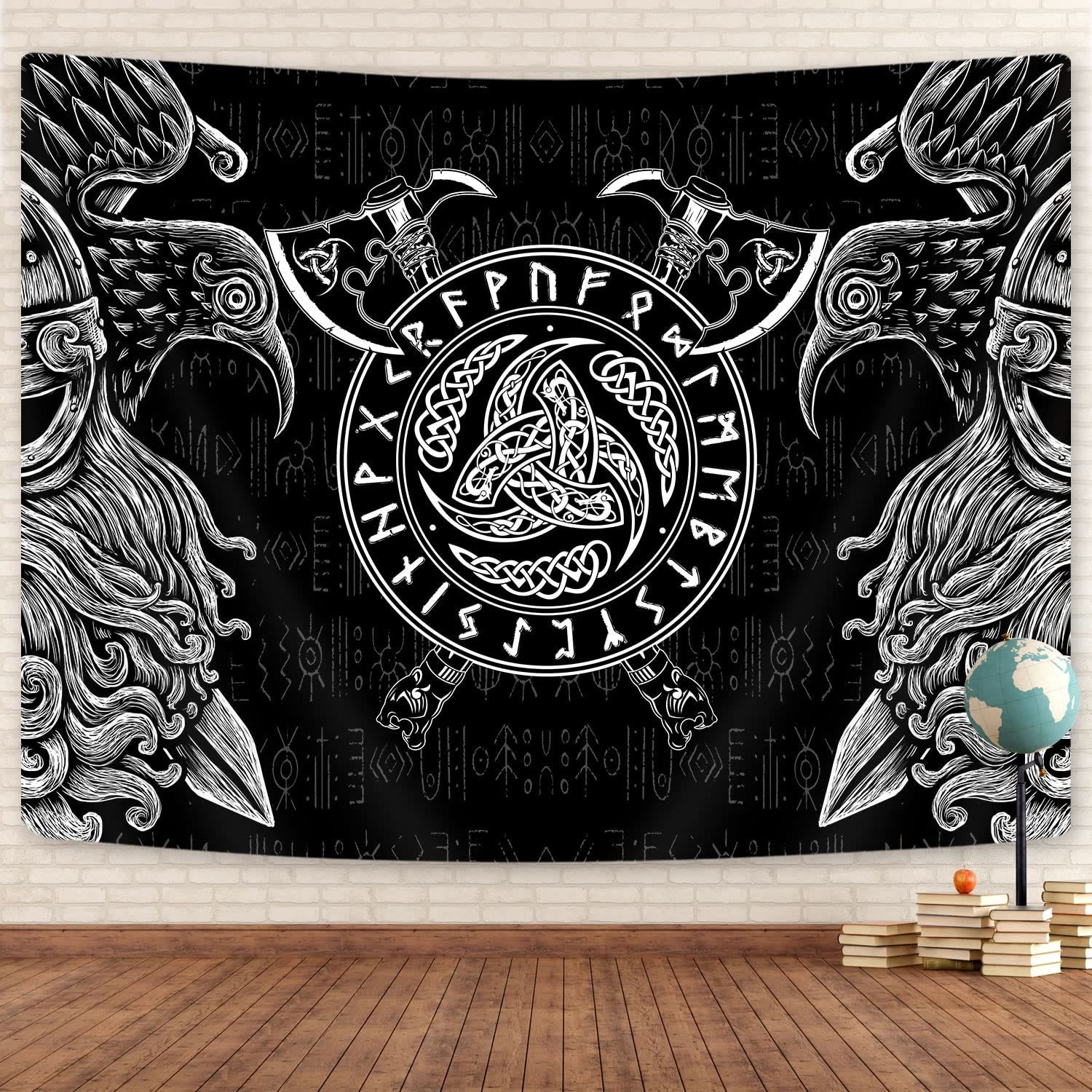 WorldNorse Viking Axe Raven Triple Horn Of Odin Tapestry