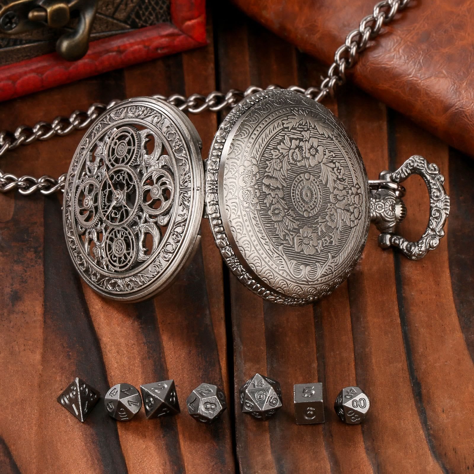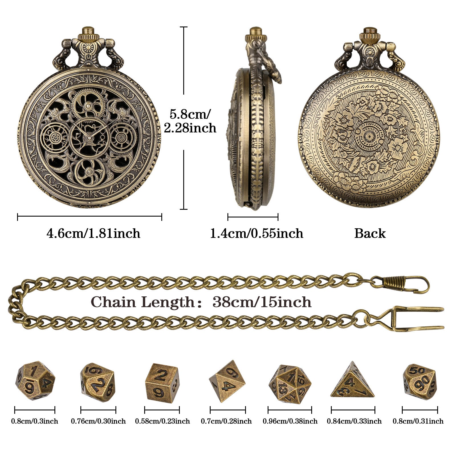 • Weight: 60g(1 x Pocket Watch Case , 1 x Chain , 7 x Dice)