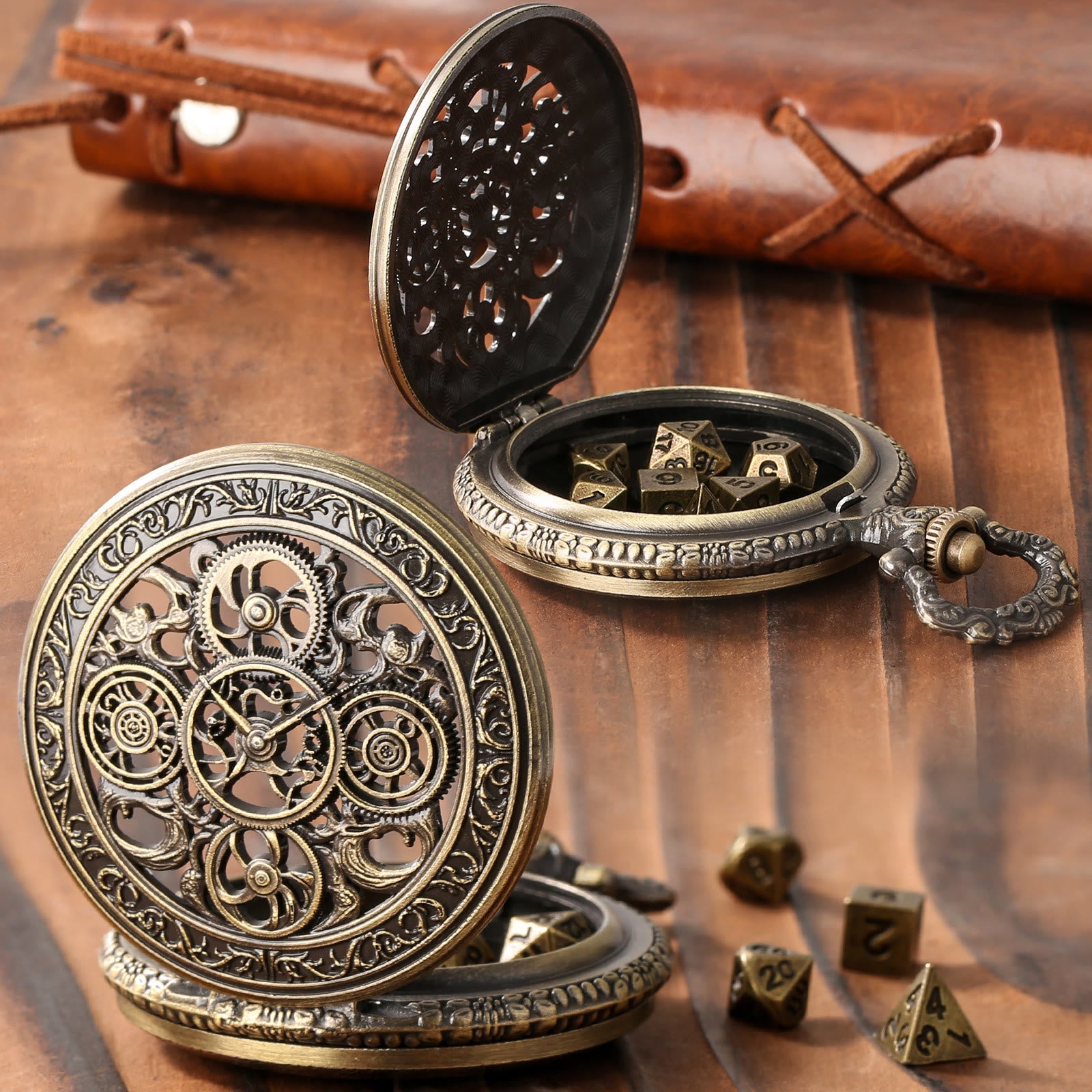 WorldNorse Punk Hollow Gears Mini Dice Set Waist Chain - Pocket Watch Case + Chain + Dice - Gold - image 0
