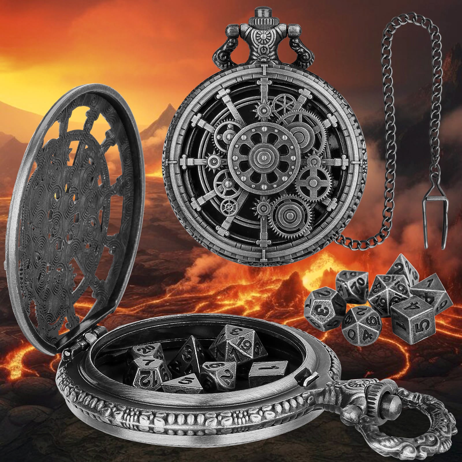 WorldNorse Steampunk Gears Dice Set Waist Chain - Pocket Watch Case + Chain + Dice - Silver - image 0